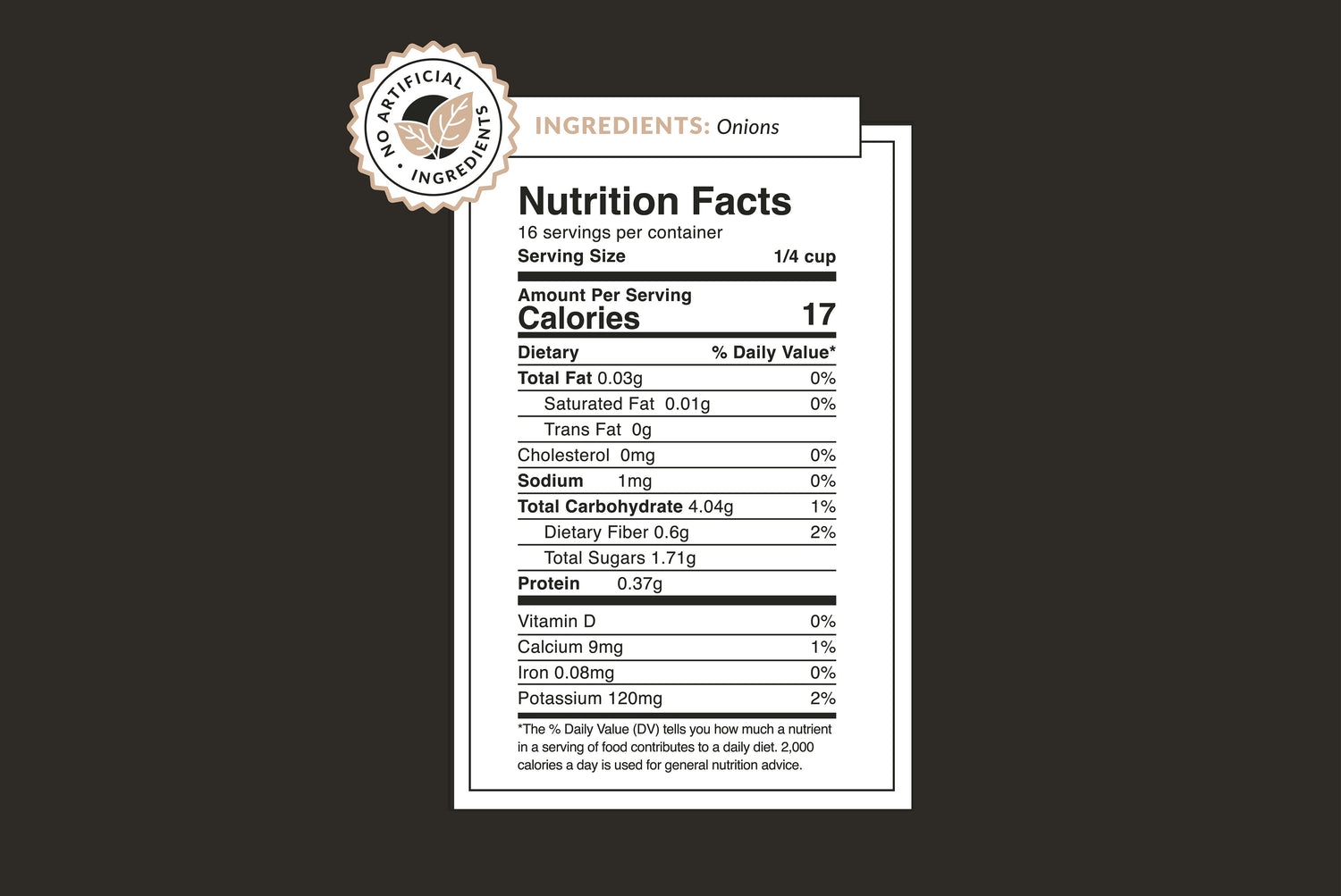 Freeze-dried onions retain most of the nutrients found in fresh onions, although some of them may be slightly reduced due to the dehydration process. Onions are low in calories and high in fiber, vitamin C, and various minerals, such as potassium and calcium. They also contain antioxidants and flavonoids that have been associated with various health benefits, including improved immune function and reduced risk of chronic diseases.
